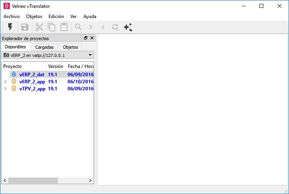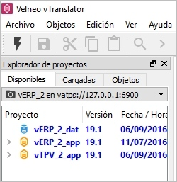 Lo primero que tenemos que hacer es conectarnos con Velneo vServer donde están alojados los proyectos a traducir. Para ello ejecutaremos la opción conectar del menú archivo.