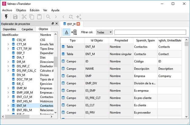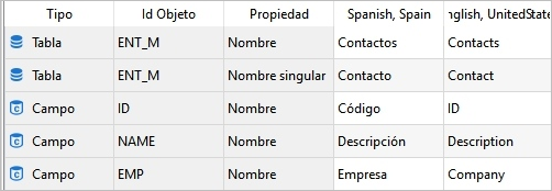En el panel principal, como ya comentamos anteriormente, se muestra la lista de recursos traducibles. Las primeras columnas muestran información sobre el objeto o sub-objeto (Tipo, Id. objeto y propiedad) y las últimas el nombre dado al objeto en cada uno de los idiomas que hayan sido declarados en el proyecto. La columna correspondiente al primer idioma será la del idioma principal del proyecto.