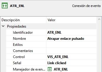 Y hemos creado la conexión de evento siguiente, que disparará el manejador de evento anterior cuando se haga clic en un enlace de la página: