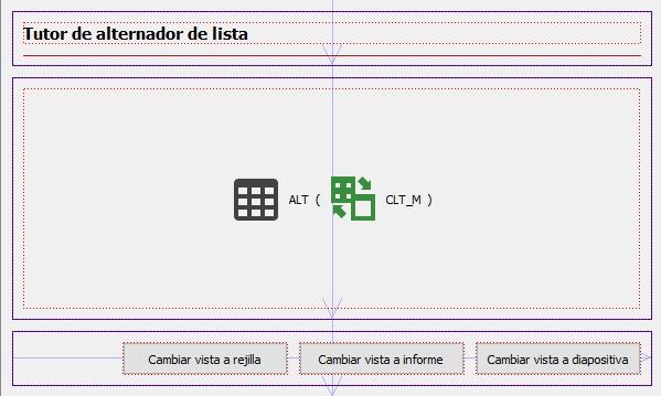 Se trata de un objeto de lista al que se le pueden declarar múltiples objeto de salida (rejilla, informe, casillero, etc.) entre los que el usuario final podrá alternar en tiempo de ejecución para mostrar una misma lista. Es decir, podremos presentar inicialmente una lista de registros en una rejilla y el usuario cambiar esa rejilla por otra rejilla, un informe, un casillero o cualquier otro objeto de lista que haya sido incluido en el alternador de lista.