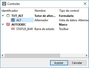 En el formulario TUT_ALT, donde se muestra el alternador de este tutor y que encontraremos en la misma carpeta de los objetos específicos de este tutor, hemos incrustado el objeto alternador y una serie de botones. Cada botón lanza un evento que cambia el objeto de salida del alternador: