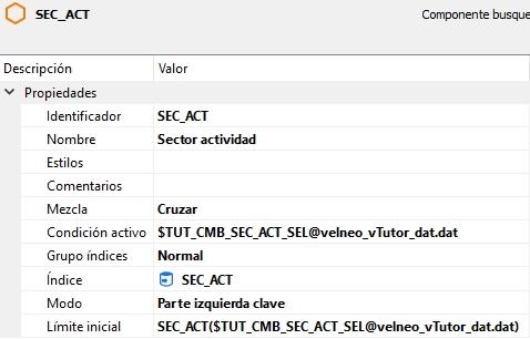 Y este índice se está resolviendo con la variable global $TUT_CMB_SEC_ACT_SEL@velneo_vTutor_dat.dat. Esto quiere decir que devolverá todos los clientes cuyo sector de actividad coincida con el almacenado en dicha variable global.