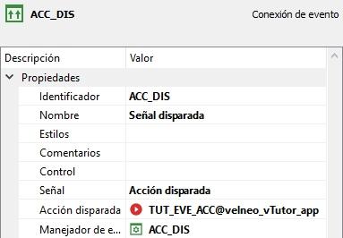 Como se puede observar, en la propiedad señal hemos establecido al valor acción disparada. Al hacerlo aparece una nueva propiedad llamada acción disparada en la que seleccionaremos la acción explicada anteriormente.