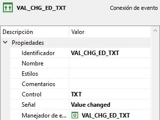 Como podemos observar, en la propiedad señal hemos seleccionado el valor value changed y la señal está asociada al control de edición de texto que está bajo la rejilla.