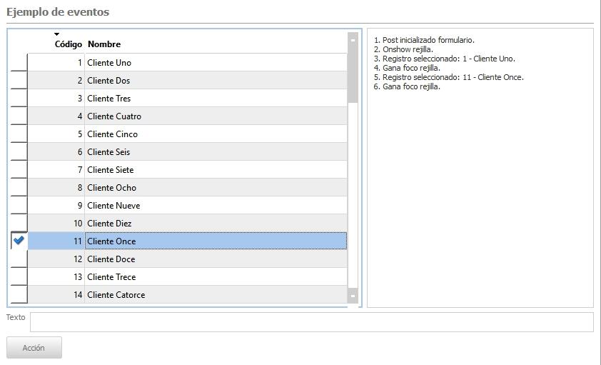Como se observar, entre otros controles, contiene una rejilla, un control de edición, un botón y un control donde se muestran los mensajes que se vayan emitiendo desde los distintos manejadores de evento que se han programado.