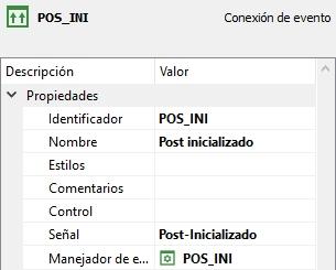 Se trata de una señal que se dispara después de inicializarse el objeto. En este caso lo que haremos será disparar un manejador de evento tras haberse inicializado el formulario. Para ello hemos programado el manejador de evento siguiente, al que hemos llamado POS_INI: