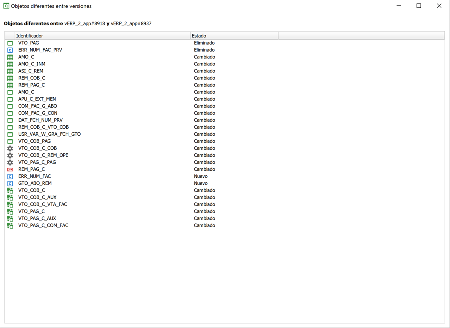 Velneo vVersion incorpora una tabla de cambios entre versiones de proyectos. Esta tabla almacena de forma automática las diferencias entre cada versión guardada y la anterior, registrando qué objetos han sido creados, eliminados o modificados.