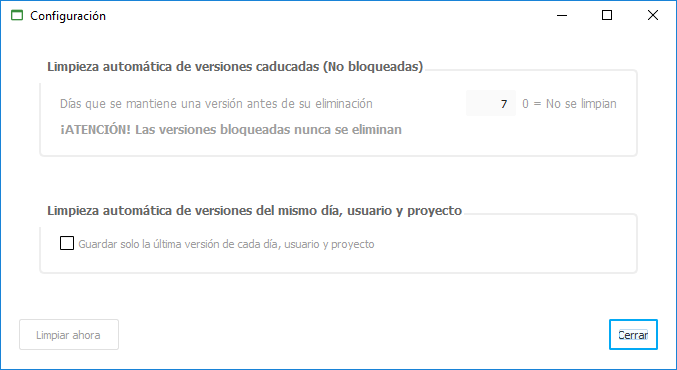 Entre las opciones del menú general se encuentra la opción config. de limpieza. En el formulario que se abre, si pulsamos el botón limpiar ahora, eliminará las versiones guardadas en el repositorio desde el pasado hasta el día que indiquemos. Sin embargo, aquellas versiones que hayamos configurado para Bloquear, no serán eliminadas y permanecerán en el repositorio hasta que se eliminen o bien manualmente o bien cambiando la configuración de bloquear previamente a lanzar de nuevo esta tarea.