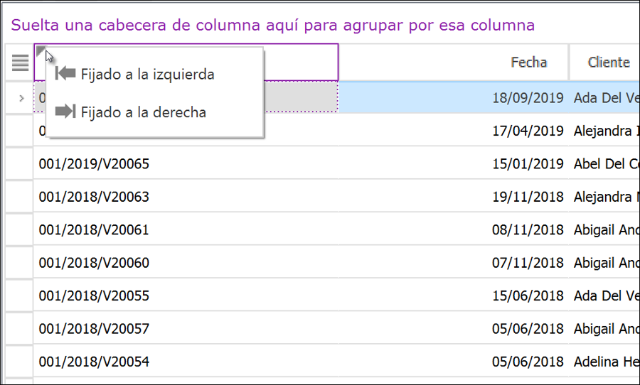 Es posible fijar una o varias columnas, tanto a la izquierda como a la derecha de la rejilla, para que estén siempre visibles cuando se haga scroll horizontal en la rejilla.