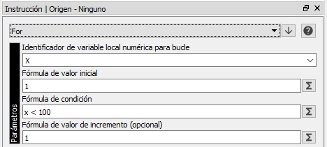 La especificación de los parámetros de un comando será asistida. En unos casos el parámetro desplegará una lista con los valores posibles que pueden ser seleccionados y en otros casos se presentará el asistente para edición de fórmulas. Tal y como hemos dicho al comienzo del artículo, en aquellos parámetros cuyo contenido sea una variable local podremos, o bien, seleccionar una declarada previamente en el proceso, o bien crearla nueva.