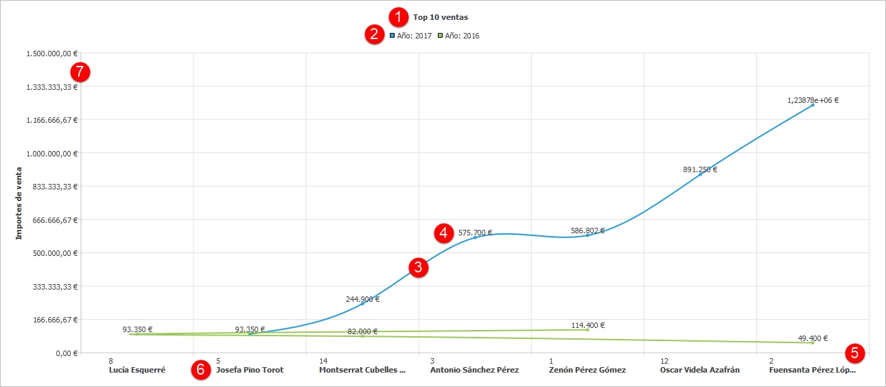 El usuario, en tiempo de ejecución, podrá multipartir un gráfico de ventas por comercial, en distintos gráficos de ventas por comercial, por provincia, etc o por ejemplo, filtrar ese mismo gráfico de ventas por comercial por el mes en curso.