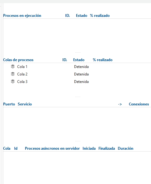En el segundo panel se muestra la lista de colas declaradas en la solución para la ejecución de procesos en 2º plano y su estado.