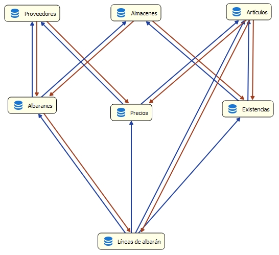 El esquema de tablas incluye dos tablas maestras: Proveedores y Artículos, que son tablas que tienen una relación de maestro a plural (1 a n) con Albaranes (por cada Albarán definimos un Proveedor) y Líneas de albarán, que es el plural de Albaranes (por cada línea de albarán definimos un Artículo).