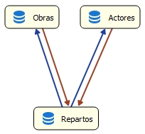 Los registros de la tabla REPARTOS consisten en parejas obra-actor, de manera que asociamos todas las obras con cada uno de sus actores (o visto de otro modo, todos los actores con cada una de las obras en las que aparece).