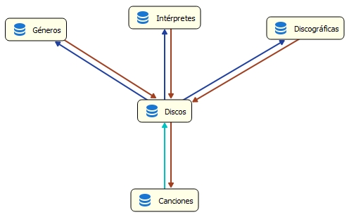 Un disco va a tener un único autor (sea solista, banda, orquesta...), mientras que un autor podrá serlo de varios discos. De igual modo, un disco habrá sido editado por una sola discográfica, mientras que una discográfica editará varios discos.