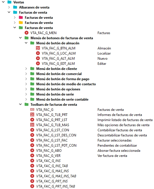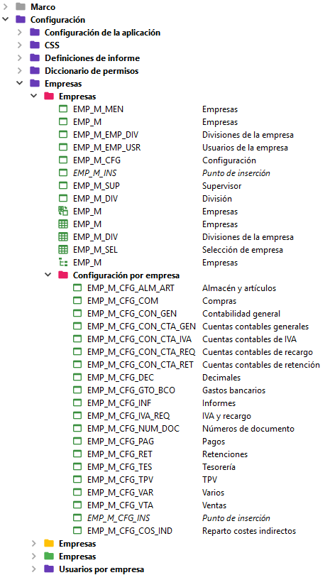 Cada de uno de los módulos dispondrá de una carpeta general y en su interior pueden darse 2 casos: crear subcarpetas con submódulos o crear subcarpetas por tabla. Este segundo caso se da con las tablas de configuración (icono Objetos 5)