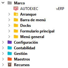 Esta carpeta contendrá diferentes subcarpetas organizadas por orden alfabético para contener objetos relaciones con los proceso arranque, barra de menú, docks, formulario principal y menú general. En definitiva objetos relaciones con el marco general de la aplicación.