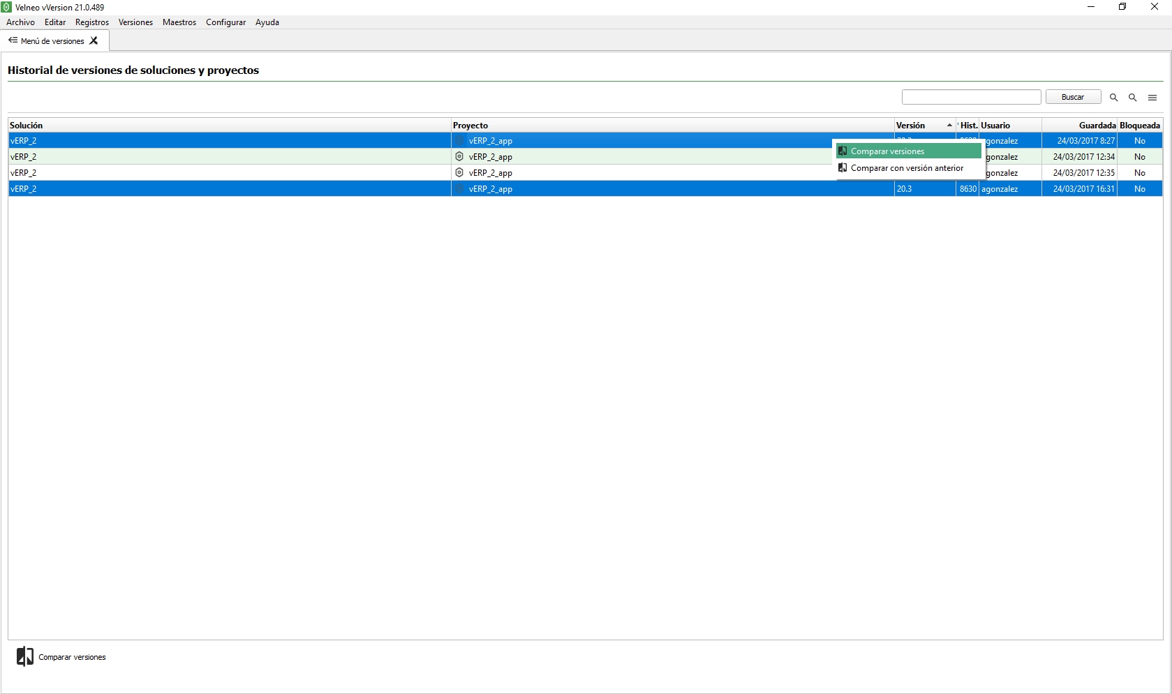 Si las modificaciones se han realizado en varias sesiones o si queremos conocer con seguridad y al detalle las propiedades y subobjetos modificados Velneo vVersion nos permite comparar 2 versiones de un proyecto.