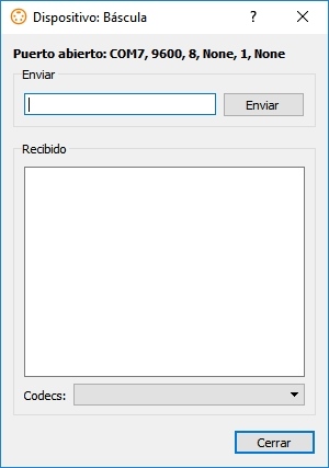 En ella el usuario podrá establecer el codec a usar, escribir la cadena a enviar al dispositivo serie y pulsar el botón “Enviar”; si el dispositivo envía una respuesta, ésta será mostrada bajo el epígrafe “Recibido”.