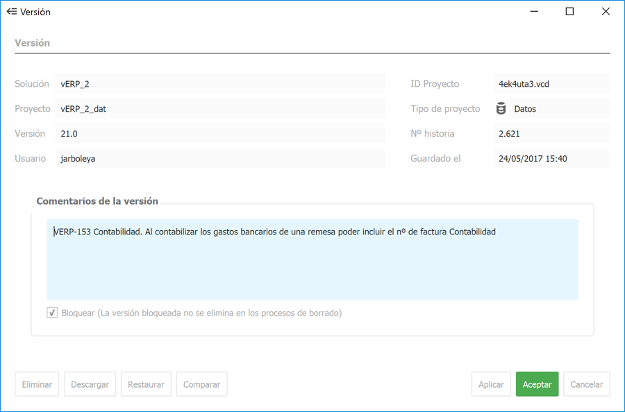 Con esta opción, disponible en el formulario de la versión, sobreescribiremos la versión actual del proyecto en el servidor con la versión que hayamos seleccionado. Bastará volver a conectarnos de nuevo al servidor con Velneo vDevelop y solicitar de nuevo el proyecto para volver a trabajar con esa versión. Será muy útil la información que provee el número de historial y que podemos ver en las propiedades del proyecto para confirmar que estamos trabajando en la versión deseada.