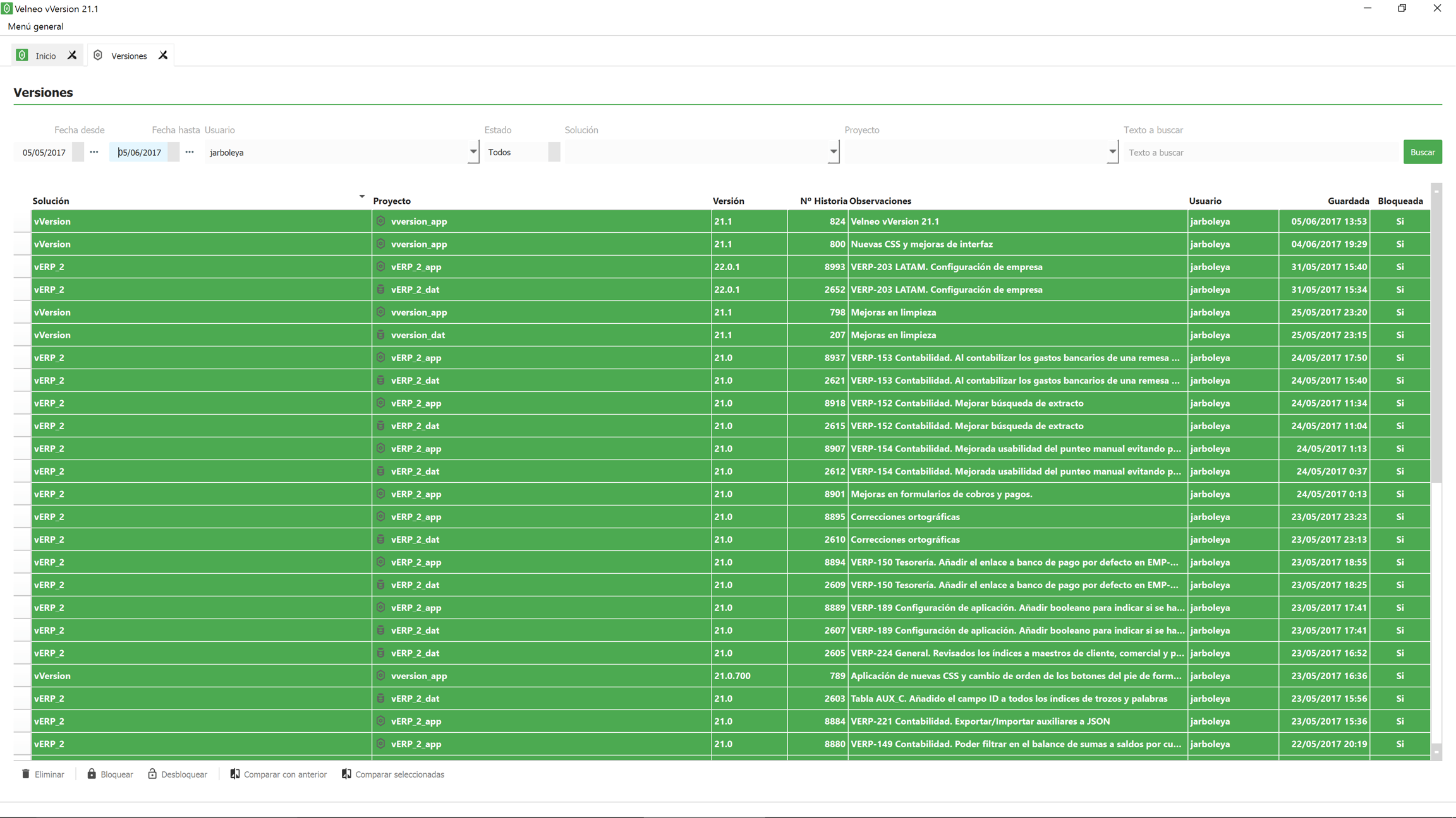 Compara con la versión anterior en un clic, seleccionando cualquier proyecto y pulsando la opción "Comparar con versión anterior". Se compara el proyecto con la versión anterior del mismo proyecto que existe en el servidor, independientemente de que desarrollador la haya guardado.